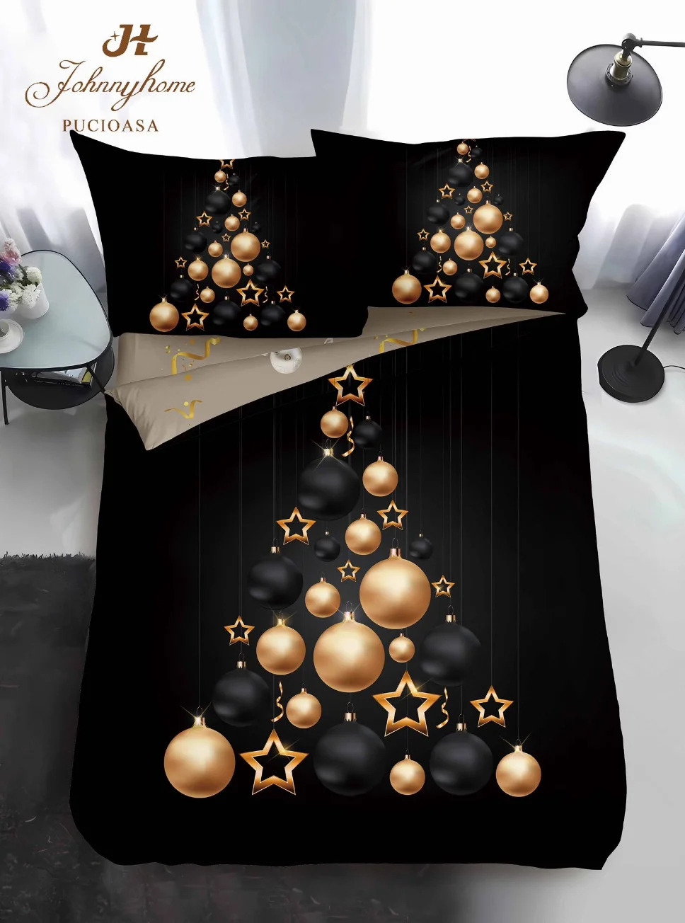 PUCIOASA Lenjerie de pat 1 persoana,Mos Craciun, negru cu globuri aurii si stelute-QY41