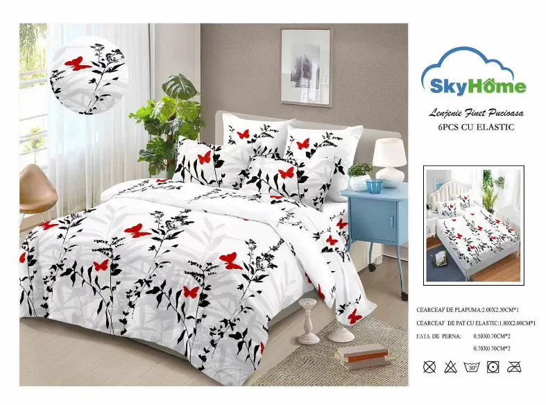 SKY HOME Lenjerii de pat Finet 6 piese cu Elastic, alb cu fluturi rosii si negri-SKE27