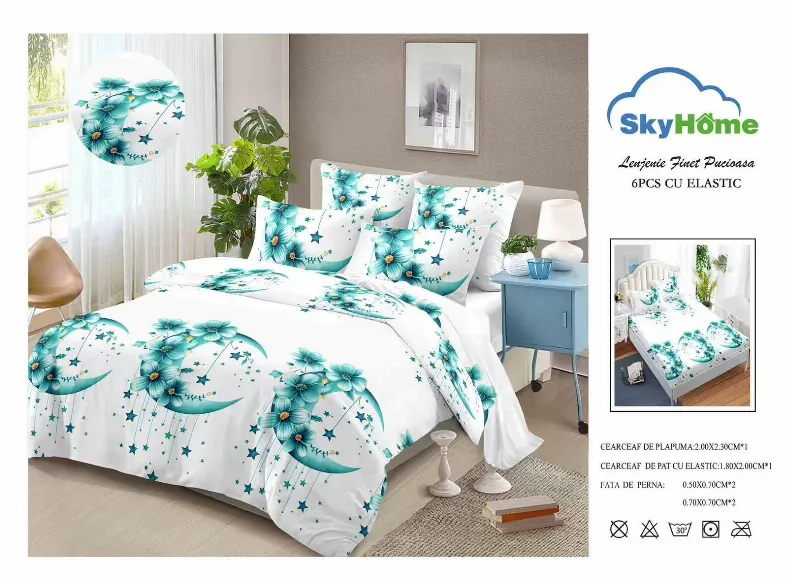 Descoperă Lenjerii de pat Finet 6 piese cu Elastic, alb cu lune si flori turcoaz-SKE26, setul care aduce în dormitorul tău echilibrul perfect între stil și confort practic. Realizată dintr-un material plăcut la atingere și rezistent, această lenjerie este concepută pentru a-ți oferi un somn liniștit și odihnitor, noapte de noapte.