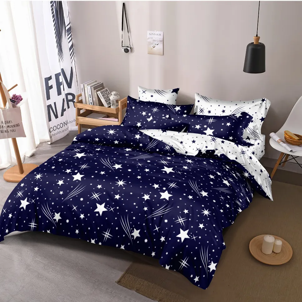 Descoperă setul Lenjerii de pat Finet 6 piese cu Elastic, bleu cu stele albe și comete-FEL259, partenerul tău ideal pentru un somn profund și relaxant. Creat dintr-un material special, plăcut la atingere și rezistent, acest set este conceput pentru a-ți aduce confort și a înfrumuseța aspectul dormitorului tău.