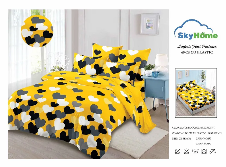 SKY HOME Lenjerii de pat Finet 6 piese cu Elastic, galben cu inimioare negre gri albe-SKE29