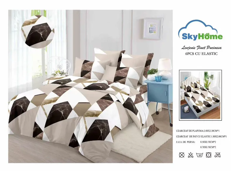 Descoperă Lenjerii de pat Finet 6 piese cu Elastic, model geometric modern bej si maro-SKE22, setul care aduce în dormitorul tău echilibrul perfect între stil și confort practic. Realizată dintr-un material plăcut la atingere și rezistent, această lenjerie este concepută pentru a-ți oferi un somn liniștit și odihnitor, noapte de noapte.