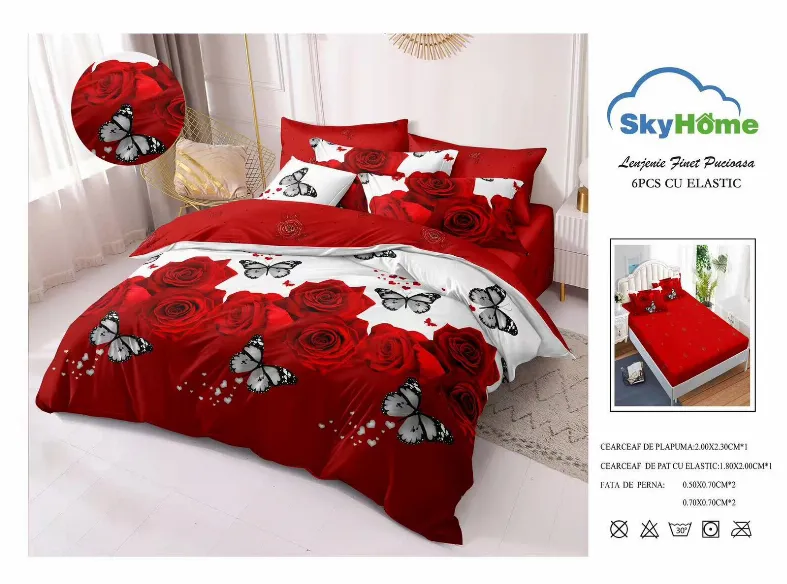 Descoperă Lenjerii de pat Finet 6 piese cu Elastic, rosu cu trandafiri si fluturi-SKE28, setul care aduce în dormitorul tău echilibrul perfect între stil și confort practic. Realizată dintr-un material plăcut la atingere și rezistent, această lenjerie este concepută pentru a-ți oferi un somn liniștit și odihnitor, noapte de noapte.