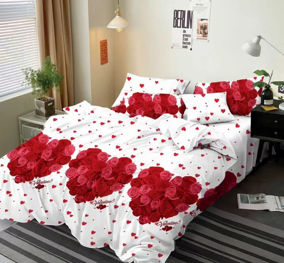 SKY HOME Lenjerie de pat Finet 6 piese, alb cu inimioare și trandafiri roșii-KY108