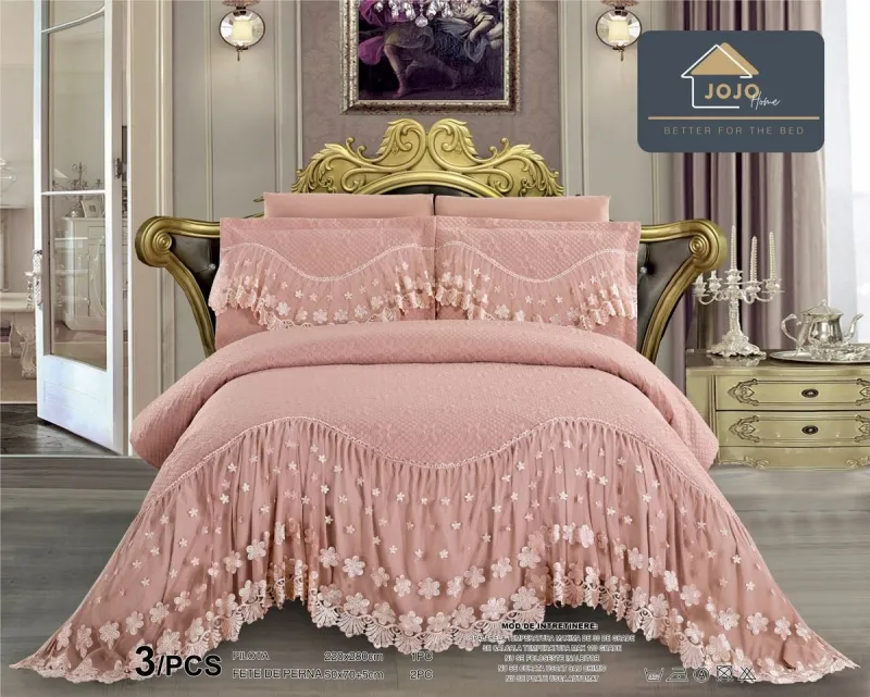 JOJO HOME Cuvertura Lux Matlasata cu Volan,Somon, Pat 2 Persoane, 3 Piese, Finet-CVJ16