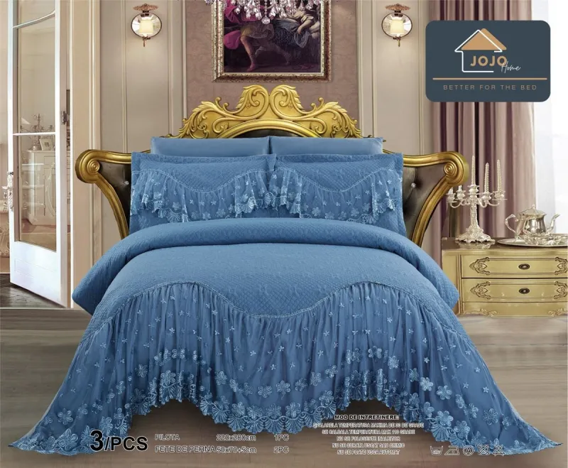 JOJO HOME Cuvertura Lux Matlasata cu Volan,albastru, Pat 2 Persoane, 3 Piese, Finet-CVJ17