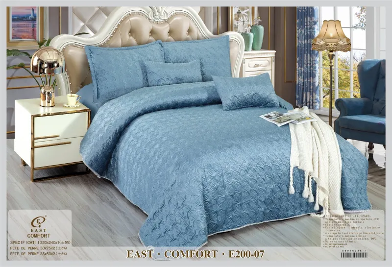 Cuverturile pat  Catifea sunt utilizate pentru decorarea dormitorului dumneavoastra si in acelasi timp de a proteja lenjeria pentru pat de impuritati. Confectionate din bumbac 80% si satin 20%, cuverturile pentru pat sunt decorate cu imprimeuri sofisticate realizate cu masinarii de ultima generatie pentru a oferi o rezistenta sporita in timp. Cuverturile sunt ideale pentru toate anotimpurile. Materialele folosite sunt de calitate buna, produsul putând fi folosit un timp foarte îndelungat. Gama de modele este larga incepand de la modele clasice pana la cele mai moderne designuri, în diferite culori, clare si luminoase.Cuverturile de pat  contureaza perfect un decor remarcabil in orice dormitor.