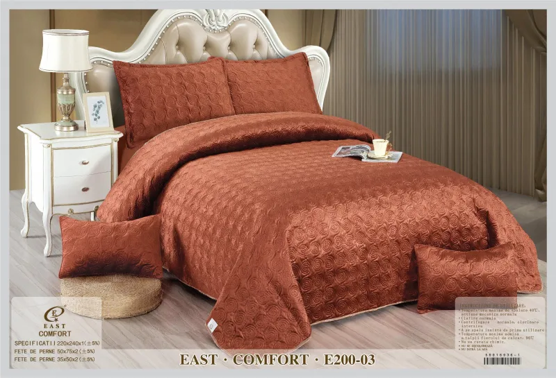 Cuverturile pat  Catifea sunt utilizate pentru decorarea dormitorului dumneavoastra si in acelasi timp de a proteja lenjeria pentru pat de impuritati. Confectionate din bumbac 80% si satin 20%, cuverturile pentru pat sunt decorate cu imprimeuri sofisticate realizate cu masinarii de ultima generatie pentru a oferi o rezistenta sporita in timp. Cuverturile sunt ideale pentru toate anotimpurile. Materialele folosite sunt de calitate buna, produsul putând fi folosit un timp foarte îndelungat. Gama de modele este larga incepand de la modele clasice pana la cele mai moderne designuri, în diferite culori, clare si luminoase.Cuverturile de pat  contureaza perfect un decor remarcabil in orice dormitor.