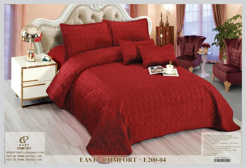 Cuverturile pat Catifea sunt utilizate pentru decorarea dormitorului dumneavoastra si in acelasi timp de a proteja lenjeria pentru pat de impuritati. Confectionate din bumbac 80% si satin 20%, cuverturile pentru pat sunt decorate cu imprimeuri sofisticate realizate cu masinarii de ultima generatie pentru a oferi o rezistenta sporita in timp. Cuverturile sunt ideale pentru toate anotimpurile. Materialele folosite sunt de calitate buna, produsul putând fi folosit un timp foarte îndelungat. Gama de modele este larga incepand de la modele clasice pana la cele mai moderne designuri, în diferite culori, clare si luminoase.Cuverturile de pat contureaza perfect un decor remarcabil in orice dormitor.Pachetul contine: