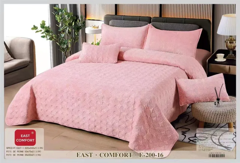 Cuverturile pat  Catifea sunt utilizate pentru decorarea dormitorului dumneavoastra si in acelasi timp de a proteja lenjeria pentru pat de impuritati. Confectionate din bumbac 80% si satin 20%, cuverturile pentru pat sunt decorate cu imprimeuri sofisticate realizate cu masinarii de ultima generatie pentru a oferi o rezistenta sporita in timp. Cuverturile sunt ideale pentru toate anotimpurile. Materialele folosite sunt de calitate buna, produsul putând fi folosit un timp foarte îndelungat. Gama de modele este larga incepand de la modele clasice pana la cele mai moderne designuri, în diferite culori, clare si luminoase.Cuverturile de pat  contureaza perfect un decor remarcabil in orice dormitor.