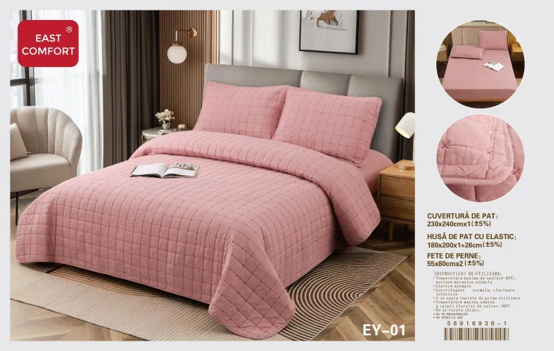 EAST COMFORT Cuvertura+Husa de pat cu elastic+2 Fete de perna,Roz-EY01