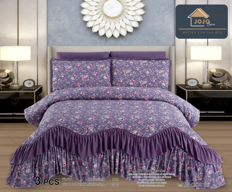 Cuvertura pat cu volanas este obtinut din bumbac 100% tratat intr-un anumit mod care face ca tesatura sa fie moale, supla si rezistenta in timp ,astfel cuvertura de pat va arata ca noua mult timp.Imprimrul acestei cuverturi de pat este modern aducand o eleganta aparte dormitorului tau.Acesta cuvertura de pat din finet poate fi oferita cadou celor dragi.