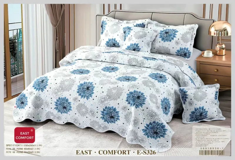 EAST COMFORT Cuvertura matlasata din bumbac 5 piese,Alb cu flori albastre-ES326