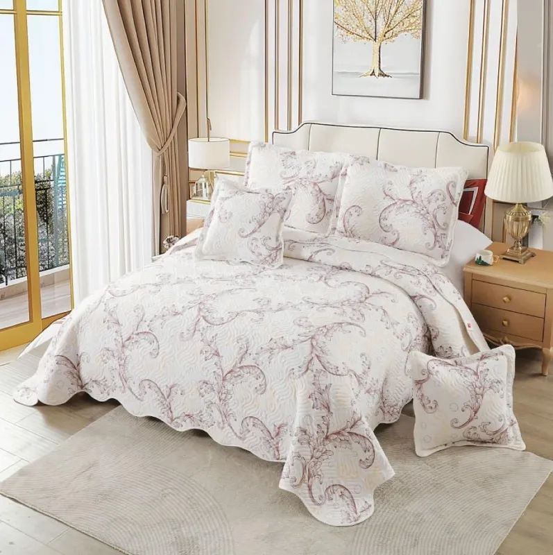 EAST COMFORT Cuvertura Matlasata, Pat Dublu, 5 Piese,Crem,frunzulite-ES355
