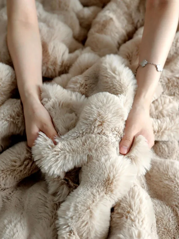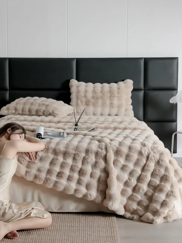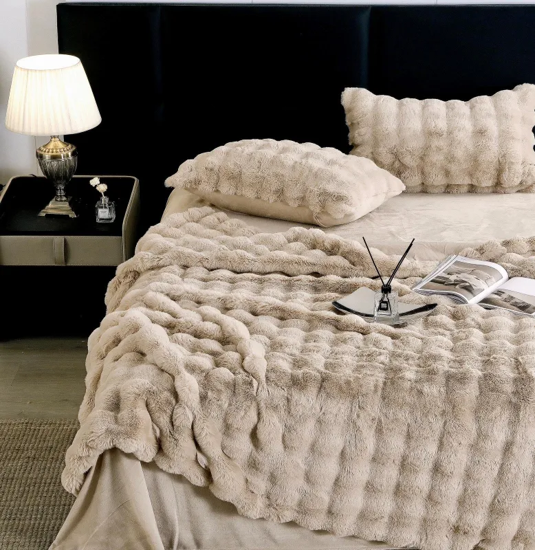 JOJO HOME Lenjerie pat dublu, ExtraPufoasa, din Blanita artificiala de Iepure, 6 piese,Bej-BV1