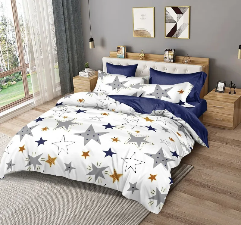 Tare faină lenjeria asta finet. Ala albastru cu steluțele alea colorate, zici că e ceru pe pat. Parcă și răcorește. S-a nimerit să-i fac o surpriză surorii mele de ziua ei, i-am zis că e un mic răsfăț pentru dânsa. Acum arată camera altfel, mai primitoare așa. Tare mulțumită sunt.