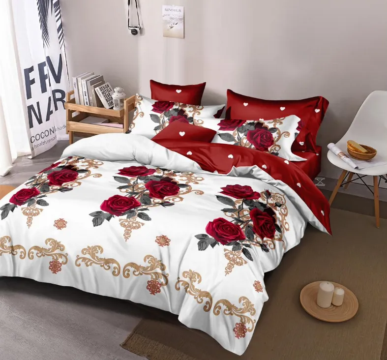 SKY HOME Lenjerie de pat Finet 6 piese, alb cu trandafiri rosii si auriu-KY86