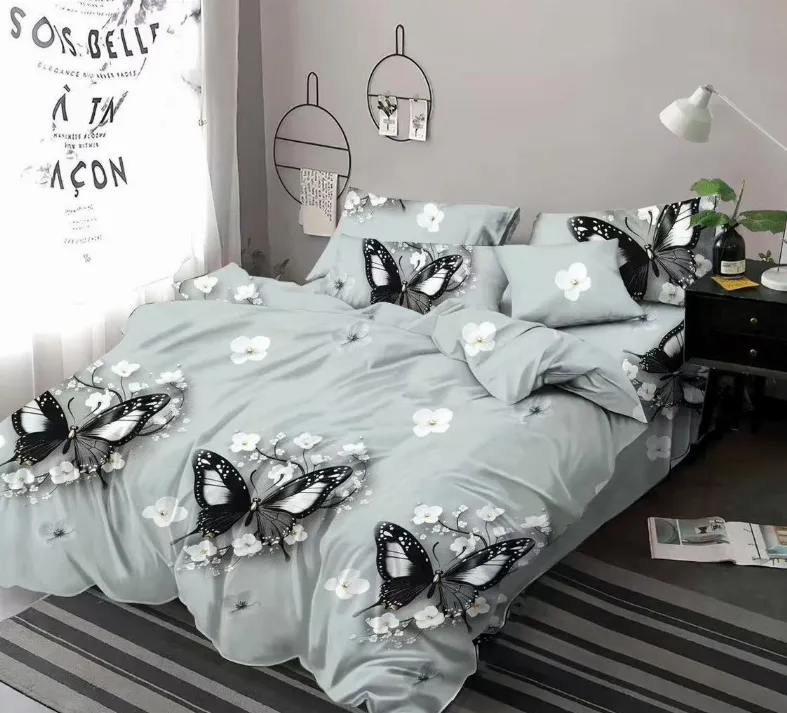 SKY HOME Lenjerie de pat Finet 6 piese, gri cu fluturi negri si flori albe-KY92