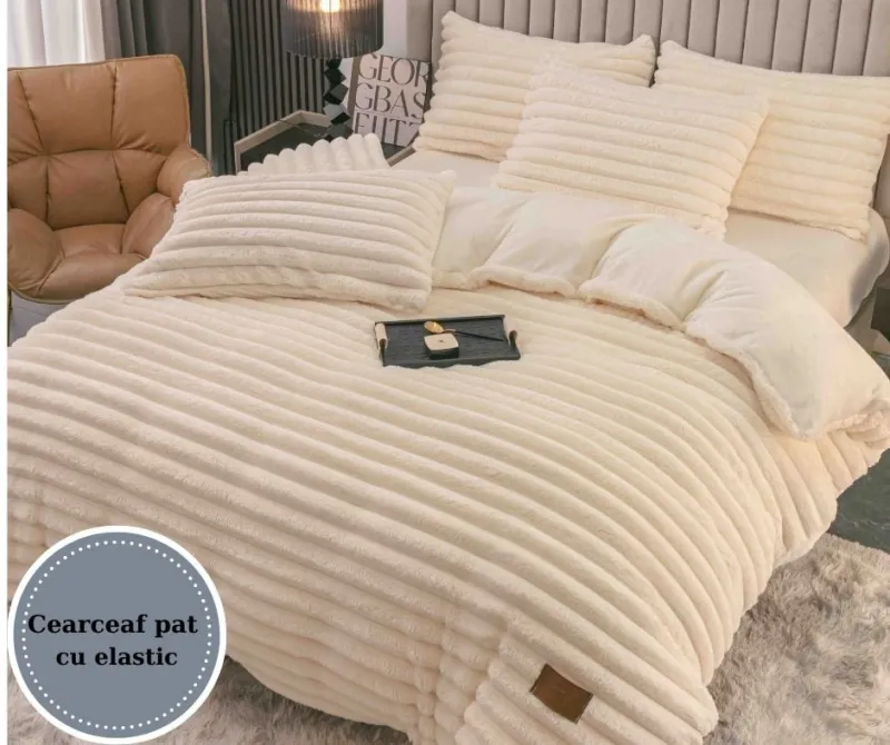 Transformă-ți dormitorul într-un sanctuar al confortului cu Lenjeria de Pat Cocolino cu Blăniță de Iepure Artificială - Set cu 4 Piese pentru Pat Dublu!