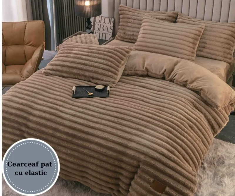 Transformă-ți dormitorul într-un sanctuar al confortului cu Lenjeria de Pat Cocolino cu Blăniță de Iepure Artificială - Set cu 4 Piese pentru Pat Dublu!