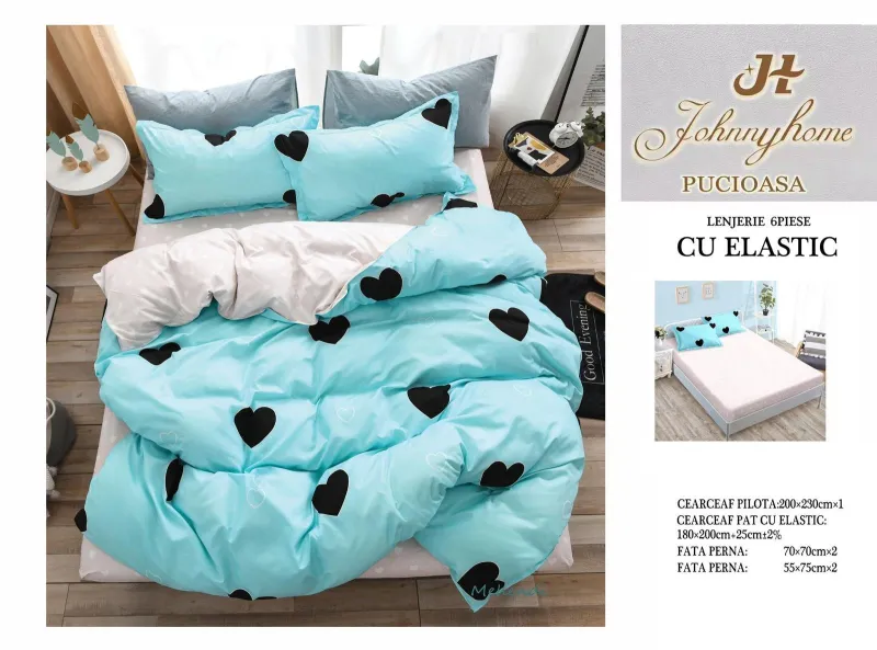 Lenjerii de pat Finet 6 piese cu Elastic-T03, descoperă confortul și rafinamentul oferite de setul de lenjerie de pat tip finet, format din 6 piese, într-o nuanță elegantă. Această colecție excepțională este realizată dintr-un bumbac tratat special, conferind tesaturii sale o senzație moale și durabilitate remarcabilă în timp. Este alegerea perfectă pentru a-ți menține patul mereu proaspăt și impecabil.