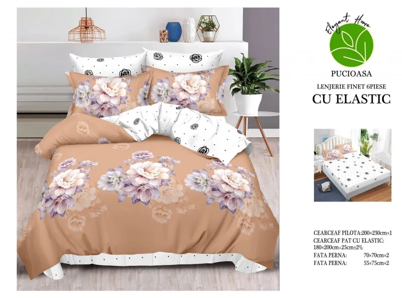 Lenjerii de pat Finet 6 piese cu Elastic-T148, descoperă confortul și rafinamentul oferite de setul de lenjerie de pat tip finet, format din 6 piese, într-o nuanță elegantă. Această colecție excepțională este realizată dintr-un bumbac tratat special, conferind tesaturii sale o senzație moale și durabilitate remarcabilă în timp. Este alegerea perfectă pentru a-ți menține patul mereu proaspăt și impecabil.