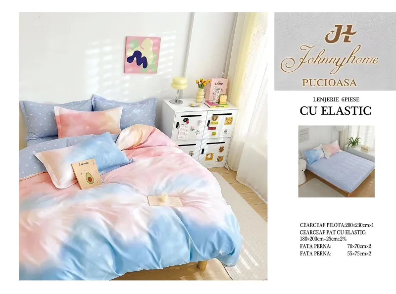Lenjerii de pat Finet 6 piese cu Elastic-T238, descoperă confortul și rafinamentul oferite de setul de lenjerie de pat tip finet, format din 6 piese, într-o nuanță elegantă. Această colecție excepțională este realizată dintr-un bumbac tratat special, conferind tesaturii sale o senzație moale și durabilitate remarcabilă în timp. Este alegerea perfectă pentru a-ți menține patul mereu proaspăt și impecabil.