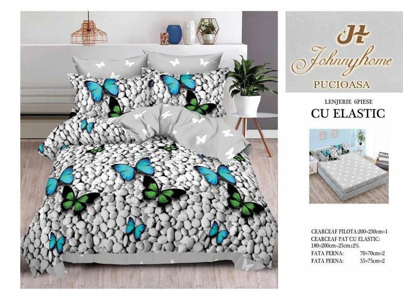 Lenjerii de pat Finet 6 piese cu Elastic-T24, descoperă confortul și rafinamentul oferite de setul de lenjerie de pat tip finet, format din 6 piese, într-o nuanță elegantă. Această colecție excepțională este realizată dintr-un bumbac tratat special, conferind tesaturii sale o senzație moale și durabilitate remarcabilă în timp. Este alegerea perfectă pentru a-ți menține patul mereu proaspăt și impecabil.