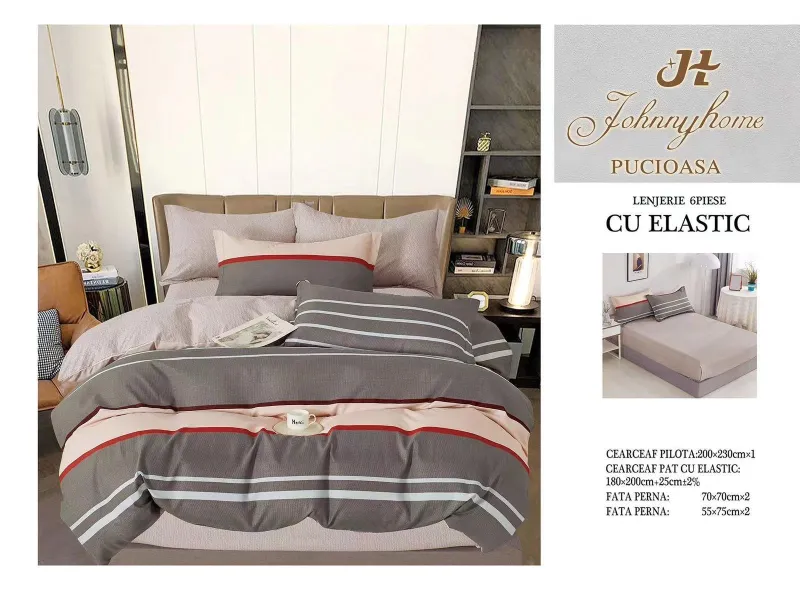 Lenjerii de pat Finet 6 piese cu Elastic-T242, descoperă confortul și rafinamentul oferite de setul de lenjerie de pat tip finet, format din 6 piese, într-o nuanță elegantă. Această colecție excepțională este realizată dintr-un bumbac tratat special, conferind tesaturii sale o senzație moale și durabilitate remarcabilă în timp. Este alegerea perfectă pentru a-ți menține patul mereu proaspăt și impecabil.