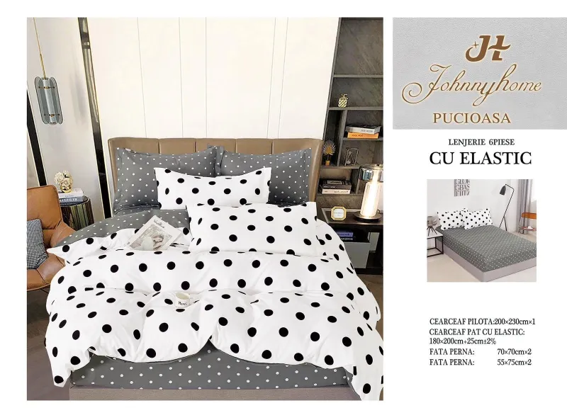 Lenjerii de pat Finet 6 piese cu Elastic-T263, descoperă confortul și rafinamentul oferite de setul de lenjerie de pat tip finet, format din 6 piese, într-o nuanță elegantă. Această colecție excepțională este realizată dintr-un bumbac tratat special, conferind tesaturii sale o senzație moale și durabilitate remarcabilă în timp. Este alegerea perfectă pentru a-ți menține patul mereu proaspăt și impecabil.
