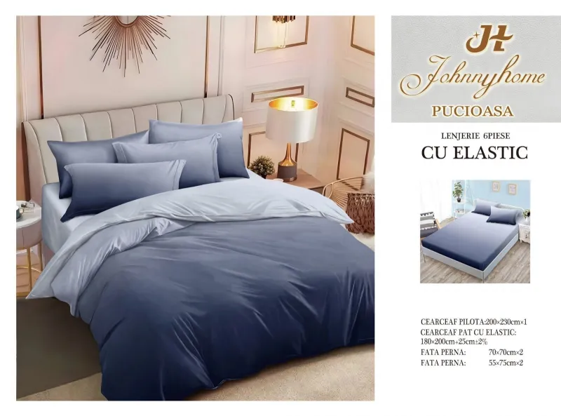 Lenjerii de pat Finet 6 piese cu Elastic-T281, descoperă confortul și rafinamentul oferite de setul de lenjerie de pat tip finet, format din 6 piese, într-o nuanță elegantă. Această colecție excepțională este realizată dintr-un bumbac tratat special, conferind tesaturii sale o senzație moale și durabilitate remarcabilă în timp. Este alegerea perfectă pentru a-ți menține patul mereu proaspăt și impecabil.