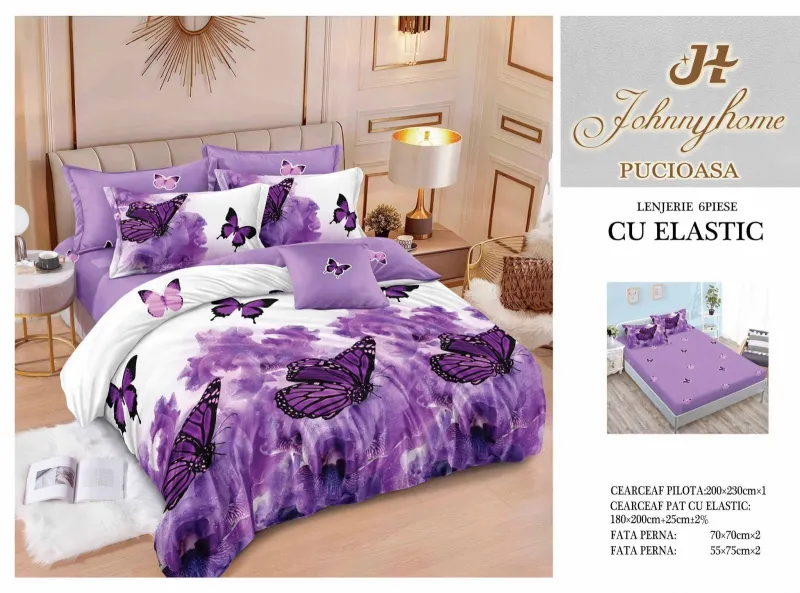 Lenjerii de pat Finet 6 piese cu Elastic-FEL92 ,descoperă confortul și rafinamentul oferite de setul de lenjerie de pat tip finet, format din 6 piese, într-o nuanță elegantă. Această colecție excepțională este realizată dintr-un bumbac tratat special, conferind tesaturii sale o senzație moale și durabilitate remarcabilă în timp. Este alegerea perfectă pentru a-ți menține patul mereu proaspăt și impecabil.