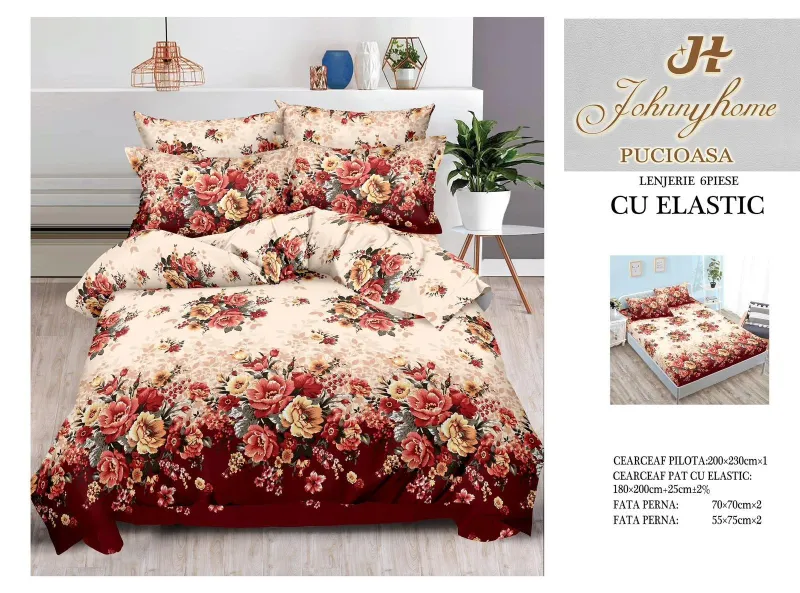 Lenjerii de pat Finet 6 piese cu Elastic-T179, descoperă confortul și rafinamentul oferite de setul de lenjerie de pat tip finet, format din 6 piese, într-o nuanță elegantă. Această colecție excepțională este realizată dintr-un bumbac tratat special, conferind tesaturii sale o senzație moale și durabilitate remarcabilă în timp. Este alegerea perfectă pentru a-ți menține patul mereu proaspăt și impecabil.