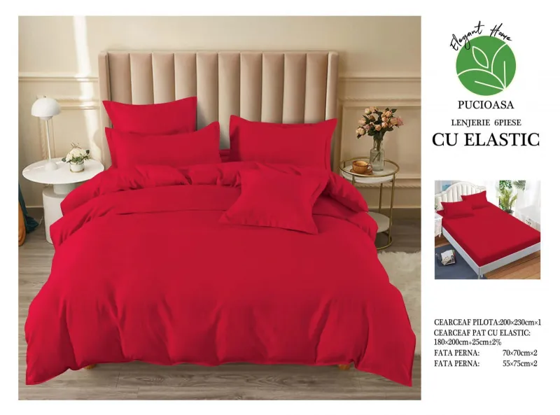 Lenjerii de pat Finet 6 piese cu Elastic,Uni, Rosu-UT18, descoperă confortul și rafinamentul oferite de setul de lenjerie de pat tip finet, format din 6 piese, într-o nuanță elegantă. Această colecție excepțională este realizată dintr-un bumbac tratat special, conferind tesaturii sale o senzație moale și durabilitate remarcabilă în timp. Este alegerea perfectă pentru a-ți menține patul mereu proaspăt și impecabil.