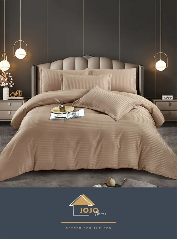 Lenjerie de pat dublu din damasc finetat, linear (tesatura din fabrica, ci nu imprimata, cu dunga de 1 cm grosime), confectionata din bumbac 70% + 30% poliester, cu 6 piese, folosita cel mai mult in regimul hotelier, datorita simplitatii si calitatii extraordinare. Materialul are un aspect usor lucios pentru o nota de eleganta si rafinament, datorita tesaturii speciale. Damascul este recunoscut pentru rezistenta sa in timp la nenumarate spalari, nemodificandu-si aspectul.