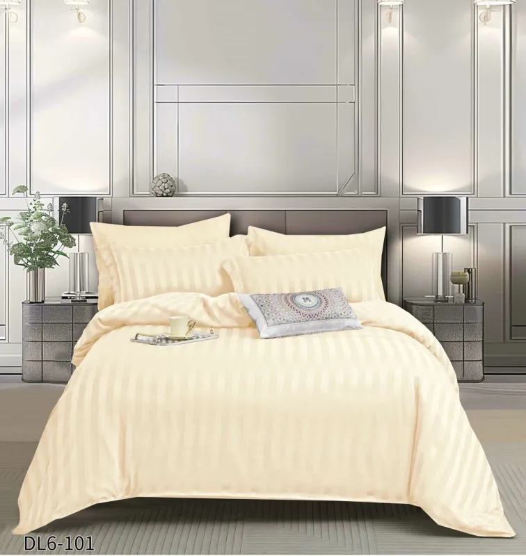 Lenjerie de pat dublu din damasc finetat, linear (tesatura din fabrica, nu imprimata, cu dunga de 1 cm grosime), confectionata din bumbac 70% + 30% poliester, cu 6 piese, folosita cel mai mult in regimul hotelier, datorita simplitatii si calitatii extraordinare. Materialul are un aspect usor lucios pentru o nota de eleganta si rafinament, datorita tesaturii speciale. Damascul este recunoscut pentru rezistenta sa in timp la nenumarate spalari, nemodificandu-si aspectul.