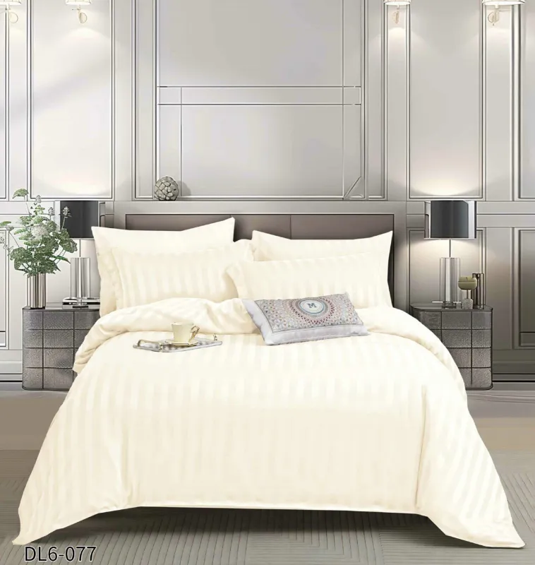 Lenjerie de pat dublu din damasc finetat, linear (tesatura din fabrica, nu imprimata, cu dunga de 1 cm grosime), confectionata din bumbac 70% + 30% poliester, cu 6 piese, folosita cel mai mult in regimul hotelier, datorita simplitatii si calitatii extraordinare. Materialul are un aspect usor lucios pentru o nota de eleganta si rafinament, datorita tesaturii speciale. Damascul este recunoscut pentru rezistenta sa in timp la nenumarate spalari, nemodificandu-si aspectul.