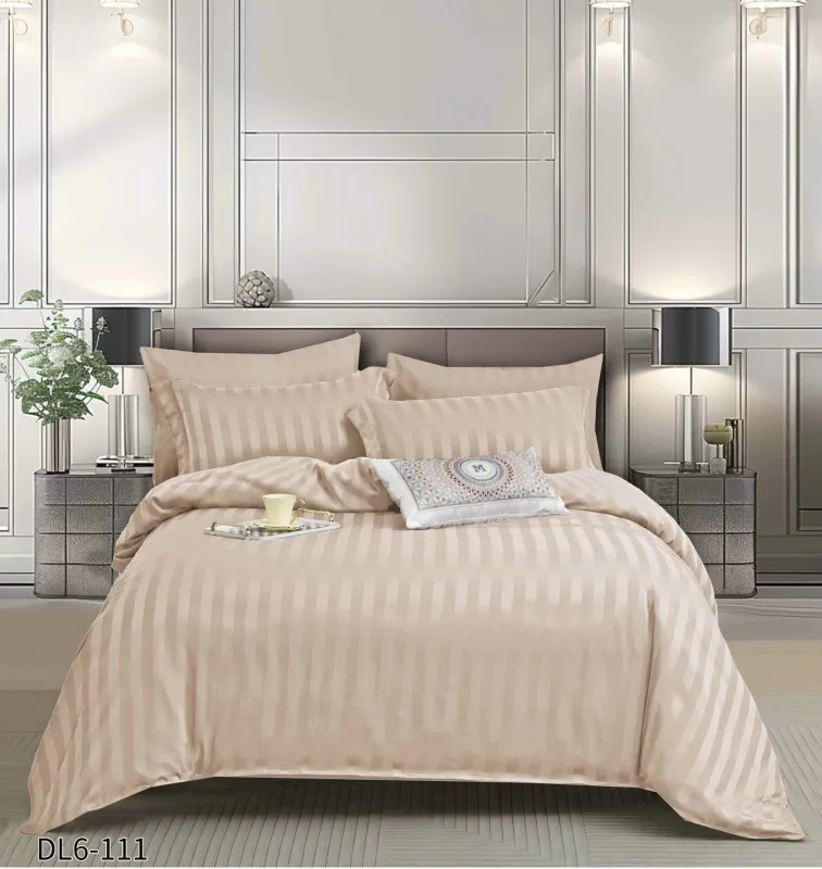 Lenjerie de pat dublu din damasc finetat, linear (tesatura din fabrica, nu imprimata, cu dunga de 1 cm grosime), confectionata din bumbac 70% + 30% poliester, cu 6 piese, folosita cel mai mult in regimul hotelier, datorita simplitatii si calitatii extraordinare. Materialul are un aspect usor lucios pentru o nota de eleganta si rafinament, datorita tesaturii speciale. Damascul este recunoscut pentru rezistenta sa in timp la nenumarate spalari, nemodificandu-si aspectul.