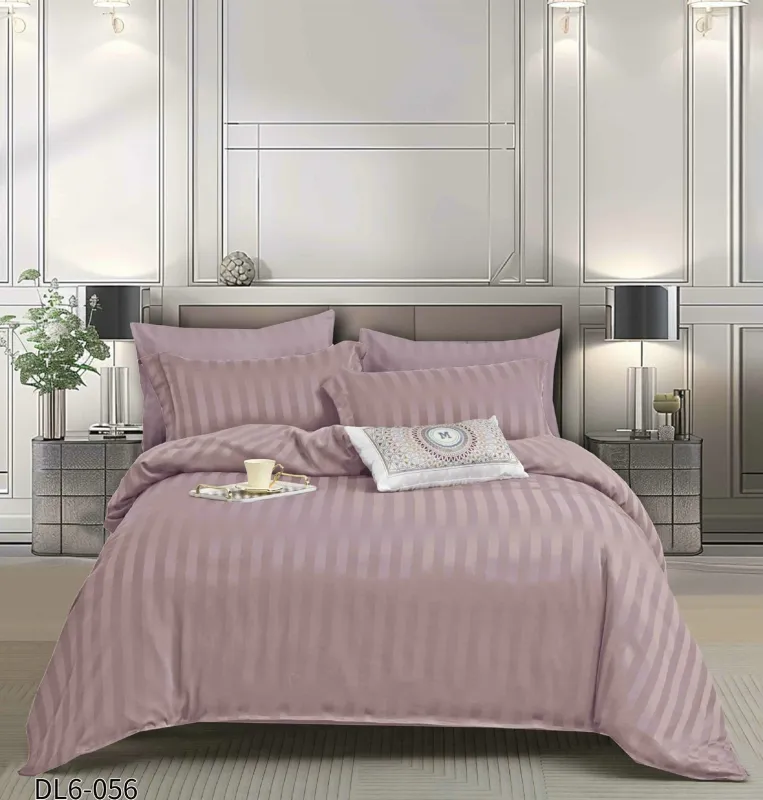 Lenjerie de pat dublu din damasc finetat, linear (tesatura din fabrica, nu imprimata, cu dunga de 1 cm grosime), confectionata din bumbac 70% + 30% poliester, cu 6 piese, folosita cel mai mult in regimul hotelier, datorita simplitatii si calitatii extraordinare. Materialul are un aspect usor lucios pentru o nota de eleganta si rafinament, datorita tesaturii speciale. Damascul este recunoscut pentru rezistenta sa in timp la nenumarate spalari, nemodificandu-si aspectul.