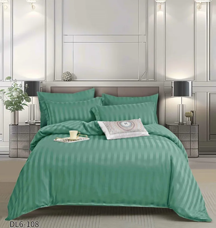 Lenjerie de pat dublu din damasc finetat, linear (tesatura din fabrica, nu imprimata, cu dunga de 1 cm grosime), confectionata din bumbac 70% + 30% poliester, cu 6 piese, folosita cel mai mult in regimul hotelier, datorita simplitatii si calitatii extraordinare. Materialul are un aspect usor lucios pentru o nota de eleganta si rafinament, datorita tesaturii speciale. Damascul este recunoscut pentru rezistenta sa in timp la nenumarate spalari, nemodificandu-si aspectul.