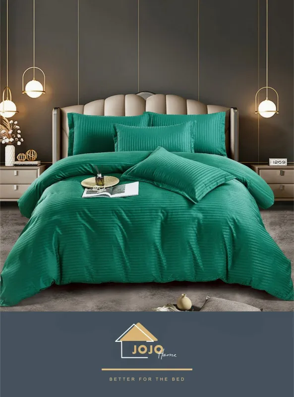 Lenjerie de pat dublu din damasc finetat, linear (tesatura din fabrica, ci nu imprimata, cu dunga de 1 cm grosime), confectionata din bumbac 70% + 30% poliester, cu 6 piese, folosita cel mai mult in regimul hotelier, datorita simplitatii si calitatii extraordinare. Materialul are un aspect usor lucios pentru o nota de eleganta si rafinament, datorita tesaturii speciale. Damascul este recunoscut pentru rezistenta sa in timp la nenumarate spalari, nemodificandu-si aspectul.