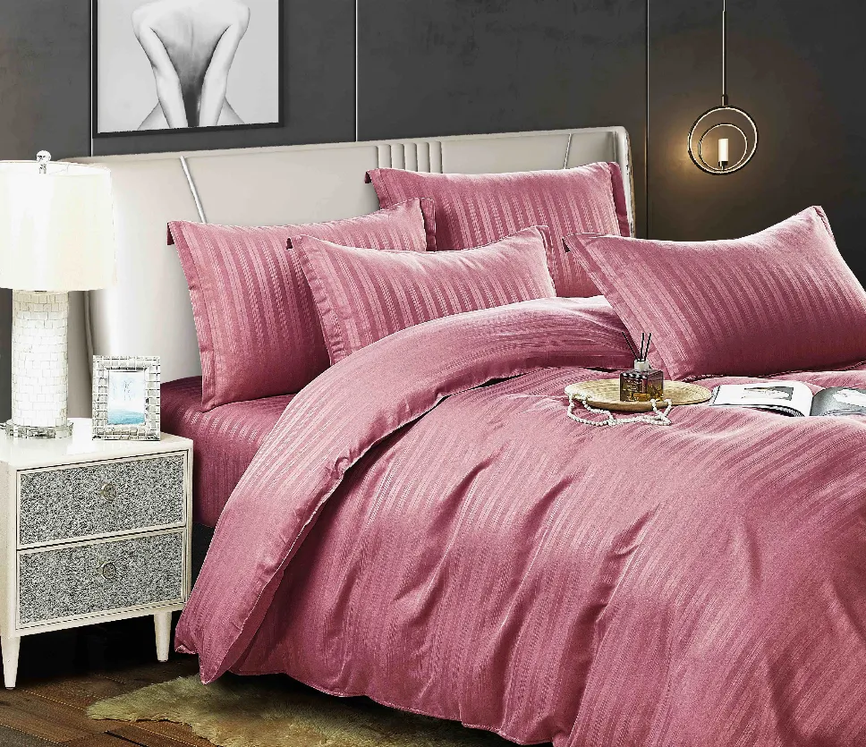 Lenjerie de pat Damasc, Pat 2 Persoane, 6 Piese, roz cu dungi subtile-DM23- Aduceți rafinamentul hotelurilor direct în dormitorul dumneavoastră. Această lenjerie de calitate superioară este creată dintr-o țesătură premium de tip damasc, renumită pentru modelul său elegant, țesut direct în material, și pentru un luciu discret, de inspirație satinată.