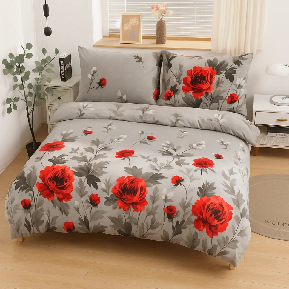 Transformă-ți dormitorul într-un refugiu de căldură și confort în zilele reci cu lenjeria de pat Lenjerie de pat Cocolino 4 piese, gri cu bujori roșii mari-LN37. Creată special pentru a te răsfăța, este alegerea ideală pentru un somn profund și relaxant, noapte de noapte.