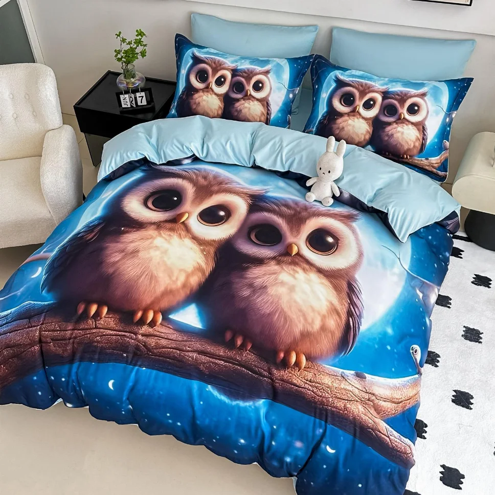 JOJO HOME Lenjerie de pat din finet, cu bufnițe drăgălașe pe ram-LD12