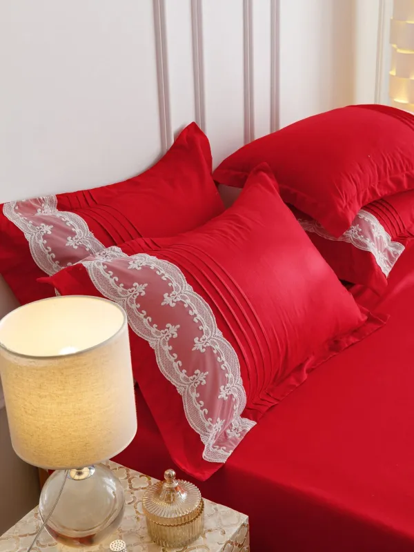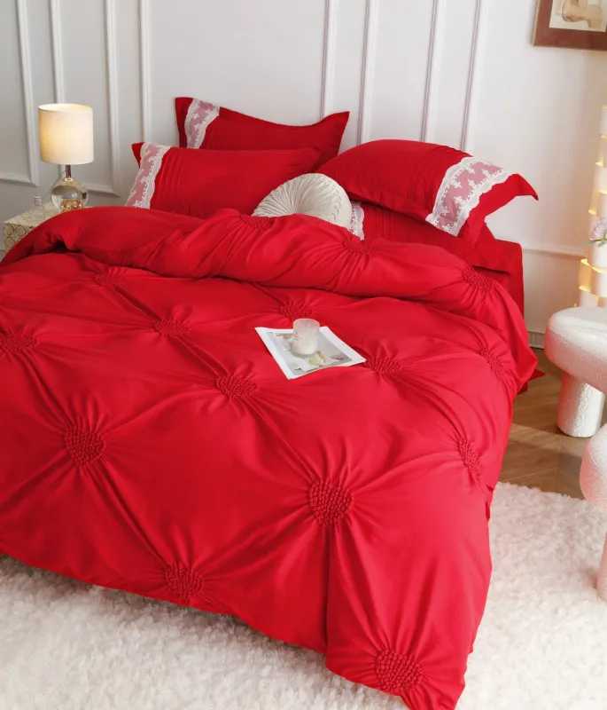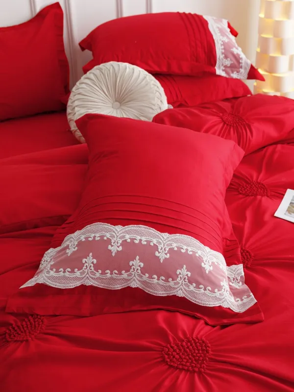 JOJO HOME Lenjerie de pat din finet, cu pliuri si inimioare brodate,Rosu-BR2