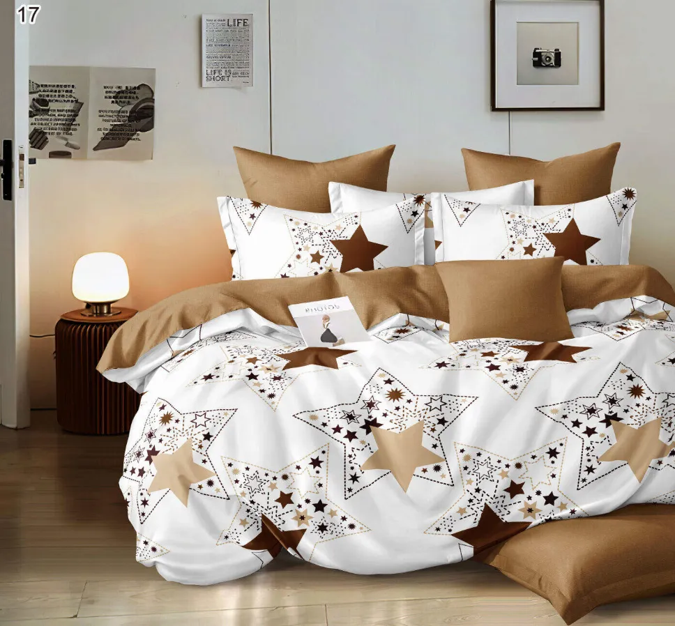 Lenjerie de pat Finet 6 piese, alb cu stele maro si bej-LP17 - Descoperă confortul și rafinamentul oferite de acest set de lenjerie de pat din finet, format din 6 piese. Colecția este realizată dintr-un material textil tratat special, conferind țesăturii o senzație moale la atingere și o durabilitate remarcabilă în timp.