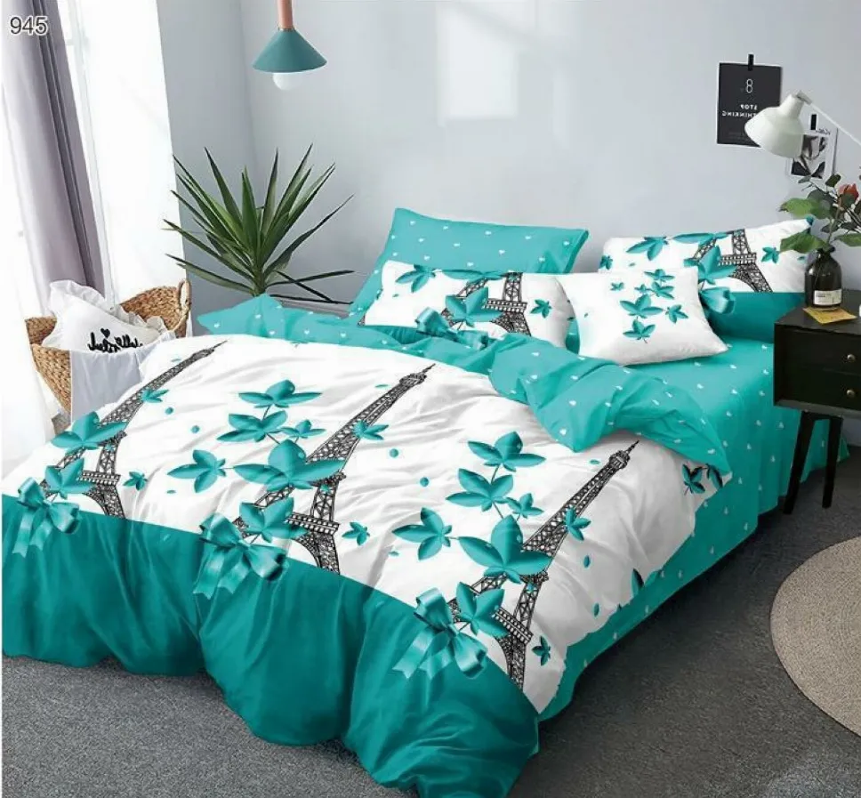 Lenjerie de pat Finet 6 piese, alb cu Turnul Eiffel turcoaz-LP945 - Descoperă confortul și rafinamentul oferite de acest set de lenjerie de pat din finet, format din 6 piese. Colecția este realizată dintr-un material textil tratat special, conferind țesăturii o senzație moale la atingere și o durabilitate remarcabilă în timp.