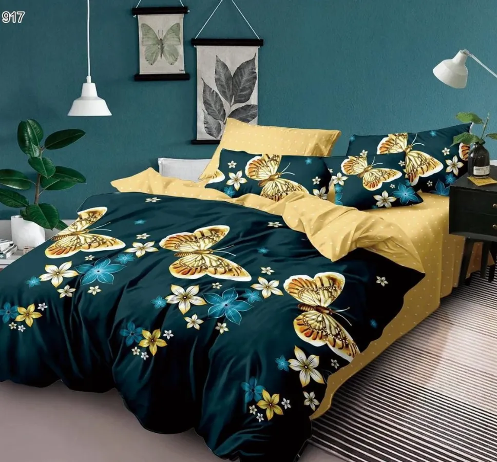 Lenjerie de pat Finet 6 piese, cu fluturi aurii și flori albastre-LP917 - Descoperă confortul și rafinamentul oferite de acest set de lenjerie de pat din finet, format din 6 piese. Colecția este realizată dintr-un material textil tratat special, conferind țesăturii o senzație moale la atingere și o durabilitate remarcabilă în timp.