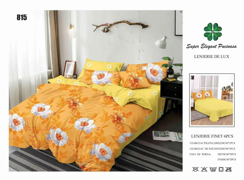 Cu lenjeria Lenjerie de pat Finet 6 piese, galben cu flori albe si portocalii-LP815, transformi dormitorul tău într-o oază de confort și rafinament. Acest set complet, format din 6 piese, este creat dintr-un material textil special tratat pentru a-ți oferi o senzație unică de finețe la atingere și o rezistență de lungă durată.
