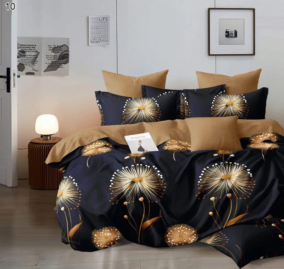 Lenjerie de pat Finet 6 piese, neagra cu pufuri aurii-LP10 - Descoperă confortul și rafinamentul oferite de acest set de lenjerie de pat din finet, format din 6 piese. Colecția este realizată dintr-un material textil tratat special, conferind țesăturii o senzație moale la atingere și o durabilitate remarcabilă în timp.